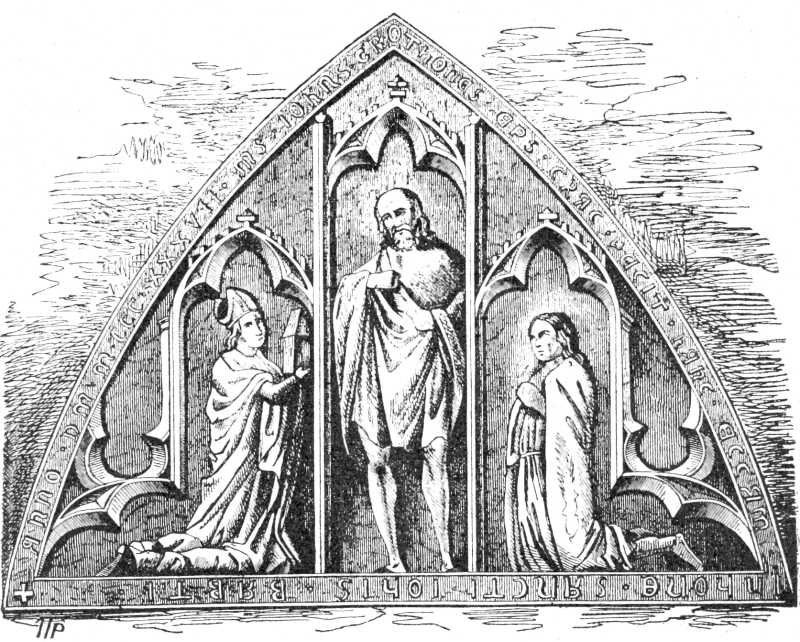 Ерекційна плита з костелу в Радлові. В центрі – фігура св.Іоана Хрестителя, зліва – біскуп Ян Грот, який подає патронові костел, справа – постать у світському одязі, імовірно, будівничий.