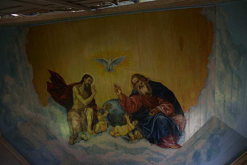 Стінопис «Новозавітня Трійця»Розмір зображення: 800:533 піксел Здається, на стелі вівтаря за іконостасом. Фото Зенона Боровця і Богдана Тхора, 5 серпня 2011 р. |