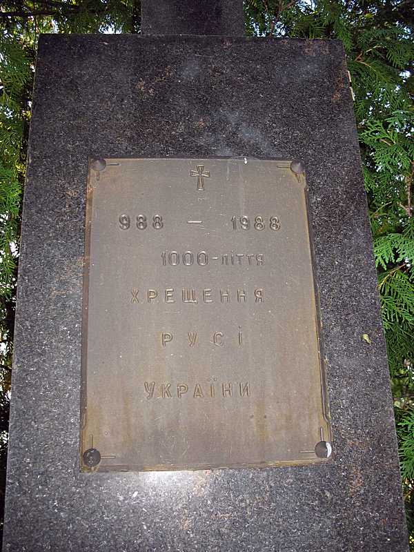 Таблиця з написомРозмір зображення: 600:800 піксел Фото Зенона Боровця, 7 вересня 2006 р. Напис: «988 – 1988. 1000-ліття хрещення Русі-України». |