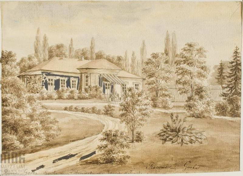 Dwór Lubomirskich na Górce. Widok od strony ogrodu parterowego dworu z półkolistym ryzalitem. Napis: Równe – Górka. Równe – Górka – Xiąże Kaźmierz Lubomirski żona Zeneida Hołyńska syn Stanisław żona Wanda Lubomirska; napis na podkładzie: G. Wołyńska. Rożyn, – Górka. 1862 – 1876. Rys. ołówkiem podmalowany akwarelą i sepią. 19,7 x 26,8 cm. Muzem Narodowe, Kraków. III-r.a. 4241 (Teka Wołyń). [Katalog rysunków architektonicznych ze zbiorów Muzeum narodowego w Krakowie. 1. Rysunki Napoleona Ordy / Opracowały Zofia Kucielska i Zofia Tobiaszowa. – Warszawa: Państwowe wydawnictwo naukowe, 1975, Nr. 612]