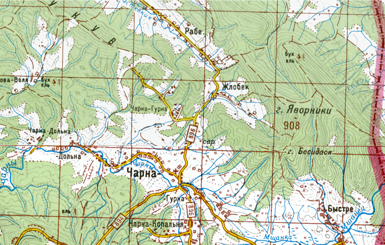 Карта (Рабе)Розмір зображення: 1294:823 піксел Карта Київської військово-картографічної фабрики, масштаб 1:100000, аркуш 106, друк 2001 р. (за матеріалами 2000 р.). |