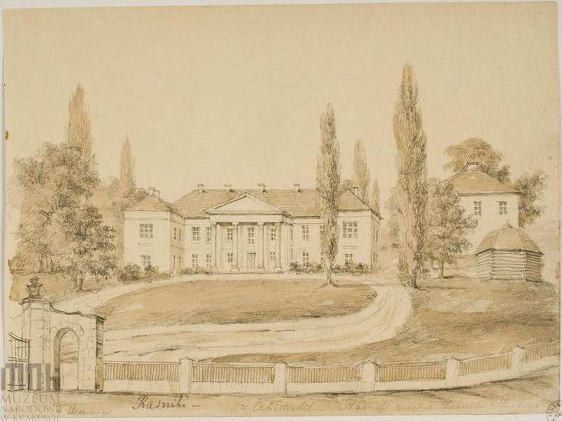 Pałac Abamelków dawniej Steckich. Widok od strony podjazdu. Pałac dwukondygnacjowy z portykiem kolumnowym w wielkim porządku i ryzalitami (?) bocznymi; z prawej strony dwukondygnacjowa oficyna. 1862 – 1876. Dat.: 4 Września. Napis: Raśniki; Xa Abemelek – Raśnik niegdyś Henryka Steckiego; napis na podkładzie: Wołyń. Raśniki – pałac. Rys. ołówkiem podmalowany sepią, 18,4x24,8. III-r.a. 4238 (Teka Wołyń) [Katalog rysunków architektonicznych ze zbiorów Muzeum narodowego w Krakowie. 1. Rysunki Napoleona Ordy / Opracowały Zofia Kucielska i Zofia Tobiaszowa. – Warszawa: Państwowe wydawnictwo naukowe, 1975, Nr. 591]