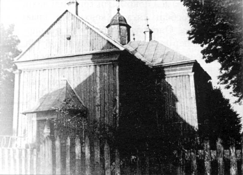 Збудована в 1804 році коштом громади й дідички села Людвіки Яблоновської. Була хрещатою будівлею латинізованого типу з елементами класицизму. Складалася з квадратової нави, до якої прилягали рівноширокі їй прямокутні бабинець, вівтар і вкорочені бічні рамена. Бічні рамена й вівтар покривали трисхилі дахи, а бабинець – двосхилий причілковий. У місці сходження гребенів даху здіймався сліпий ліхтар з маківкою. Ще чотири невеликі ліхтарі з маківками вінчали гребені дахів рамен хреста. Шальовані вертикально дошками й лнштвами стіни храму завершував великий профільований ґзнмс. Роги споруди прикрашали накладні лиштви з капітелями й базами. Підвалини прикривав острішок. Згоріла в березні 1973 року.
