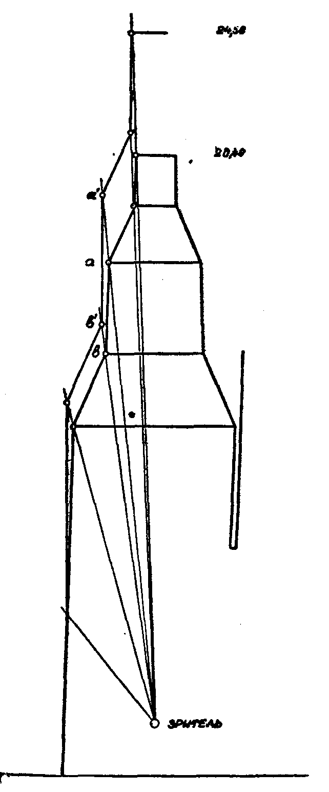Ілюзорному підвищенню приміщення також сприяє невеликий нахил стін усередину приміщень. Справді, схема розрізу церкви в м. Полтаві (рис. 23) показує, що коли глядач стоїть у приміщенні і дивиться вгору око його не сприймає невеликого нахилу стіни, а йому здається, що стіна вертикальна. З теорії перспективи відомо, що при близькій відстані високих об’єктів з’являється перспективне скорочення угору, до третього фокусу; глядач приймає нахил стін усередину за це перспективне скорочення і положення точок «а» і «б» йому здається іншим, тобто положенням а’, б’ і тому приміщення здається вищим, ніж воно є насправді. На рисунку розрізу бокової башти церкви Калнишевського, яка має висоту 20,4 метра, показано, що завдяки легкому нахилові стін висота башти ілюзорно збільшується до 24-25 метрів.