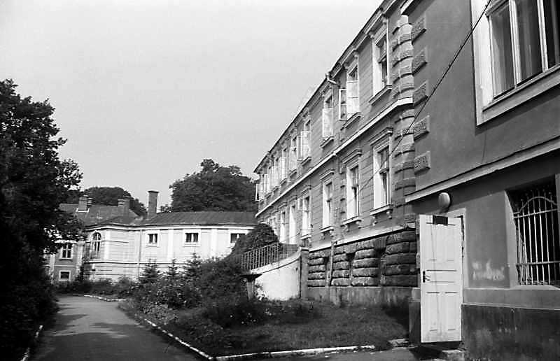 1989 р. Вигляд зі сходуРозмір зображення: 800:516 піксел Флігель, галерея, південний фасад центрального корпусу і фрагмент східного корпусу. 1989 р. 3 липня. Фото М.І.Жарких. Негатека, № 508-14. |