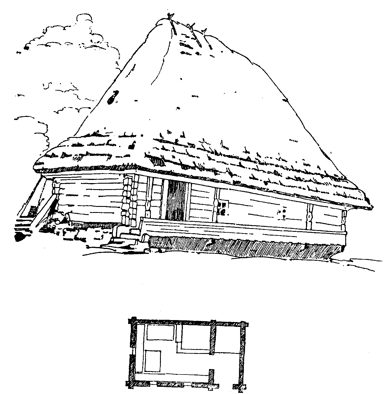 [1949 р.] Хата бойка в с. Ростоки, Бойківщина. План і загальний виглядРозмір зображення: 1366:1375 піксел Джерело: Юрченко П.Г. Дерев’яне зодчество України. – К.: 1949 р., с. 68. Не факт, що це наша Розтока, може, й інша. |
