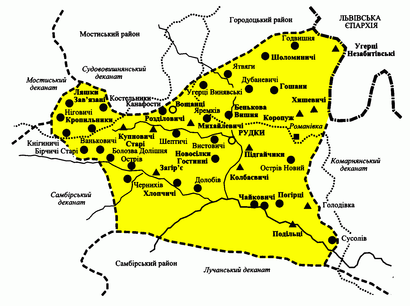 Картосхема деканату за В.СлободяномРозмір зображення: 1624:1214 піксел Джерело: Слободян В. Церкви України: Перемиська єпархія. – Льв.: 1998 р., с. 479. |