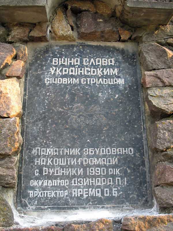 Напис: «Віча слава українським січовим стрільцям. Пам’ятник збудовано на кошти громади с. Рудники. 1990 рік. Скульптор Дзиндра П. І. Архітектор Ярема О. Б.»