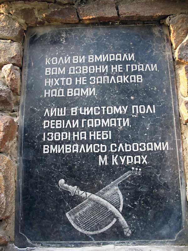 Пам’ятний написРозмір зображення: 600:800 піксел Фото Зенона Боровця, 18 липня 2007 р. Напис: «Коли ви вмирали, Вам дзвони не грали, Ніхто не заплакав над вами. Лиш в чистому полі Ревіли гармати І зорі на небі Вмивались сльозами. М. Курах» |
