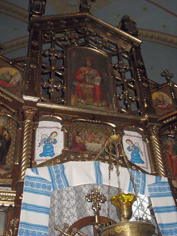 Центральна частина іконостаса Розмір зображення: 600:800 піксел Фото Зенона Боровця, 18 липня 2007 р. Вкладені елементи Ікона «Христос цар» Ангел Ікона «Таємна вечеря»