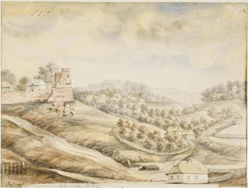 Ruiny zamku Czartoryskich. Widok ogólny z fragmentem usytuowanych na wzgórzu ruin zamku. 1862 – 1876. Napis: Rydomł; napis na podkładzie: Gub. Wołyńska. Rydomł; napis na kartce doklejonej do podkładu: Rydomt (Gubernia Wołyńska), Regina na Hoszczy Księżna Sołomerecka darowała majętność i dawny Zamek rodzinny r. 1637 Księciu Mikołajowi Czartoryskiemu i jego żonie Izabeli Siostrze Księcia Samuela Koreckiego — teraz Własność Hr. Alexandra Rzyszzewskiego; ostatni napis powtórzony w języku francuskim, Rys. ołówkiem podmalowany akwarelą, 20,5x27. II-r.a. 4244 (Teka Wołyń). Jibl.: Album widoków, seria III, il. 98. [Katalog rysunków architektonicznych ze zbiorów Muzeum narodowego w Krakowie. 1. Rysunki Napoleona Ordy / Opracowały Zofia Kucielska i Zofia Tobiaszowa. – Warszawa: Państwowe wydawnictwo naukowe, 1975, Nr. 621]
