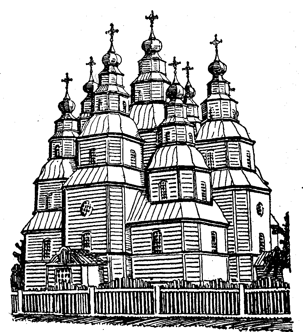 Загальний вигляд. Рисунок В.СічинськогоРозмір зображення: 1010:1107 піксел Джерело: Драган М. Українські деревляні церкви. – Льв..: 1937 р., т. 2, с. 130. |