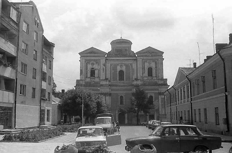 1997 р. Костел у перспективі вулиціРозмір зображення: 800:530 піксел 1997 р. 9 серпня. Фото М.І.Жарких. Негатека, № 918-11. |