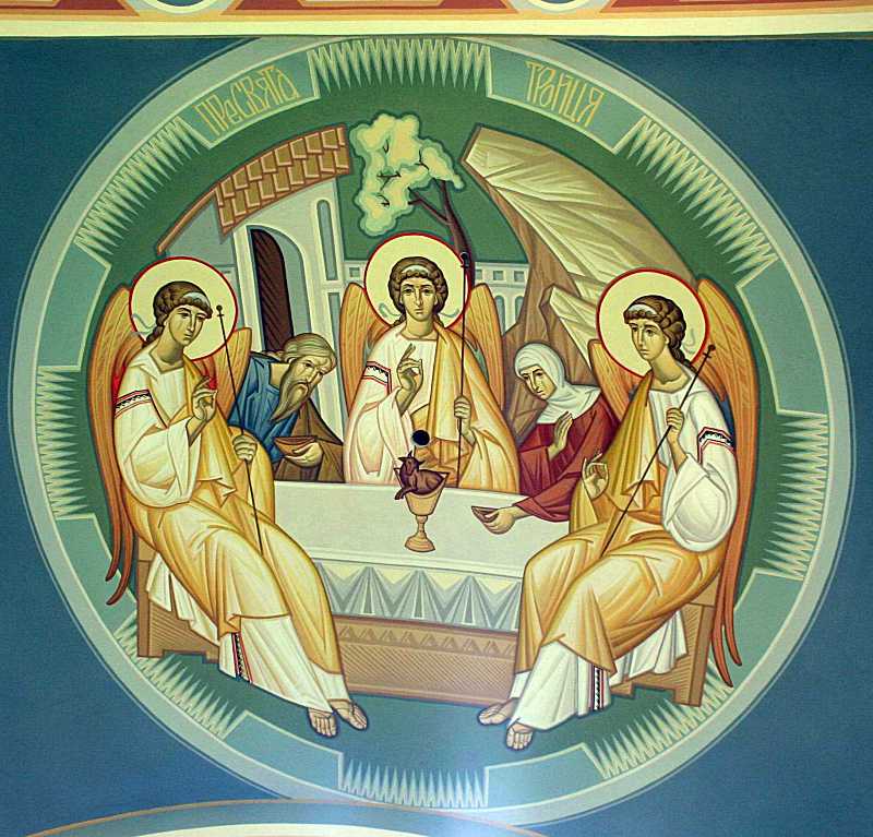Ветхозавітна трійцяРозмір зображення: 800:767 піксел Фото Зенона Боровця і Богдана Тхора, 10 липня 2014 р. Стінопис склепіння трансепта. |