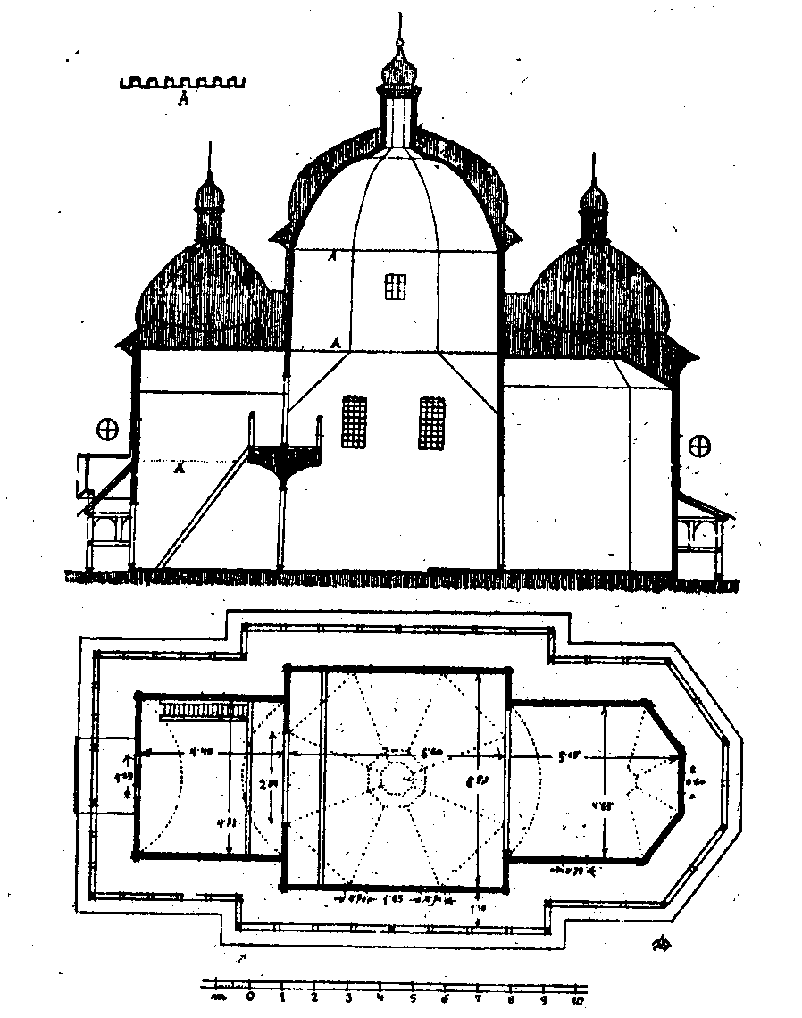 Поздовжній переріз і планРозмір зображення: 898:1140 піксел Джерело: Драган М. Українські деревляні церкви. – Льв.: 1937 р., т. 2, с. 15. |