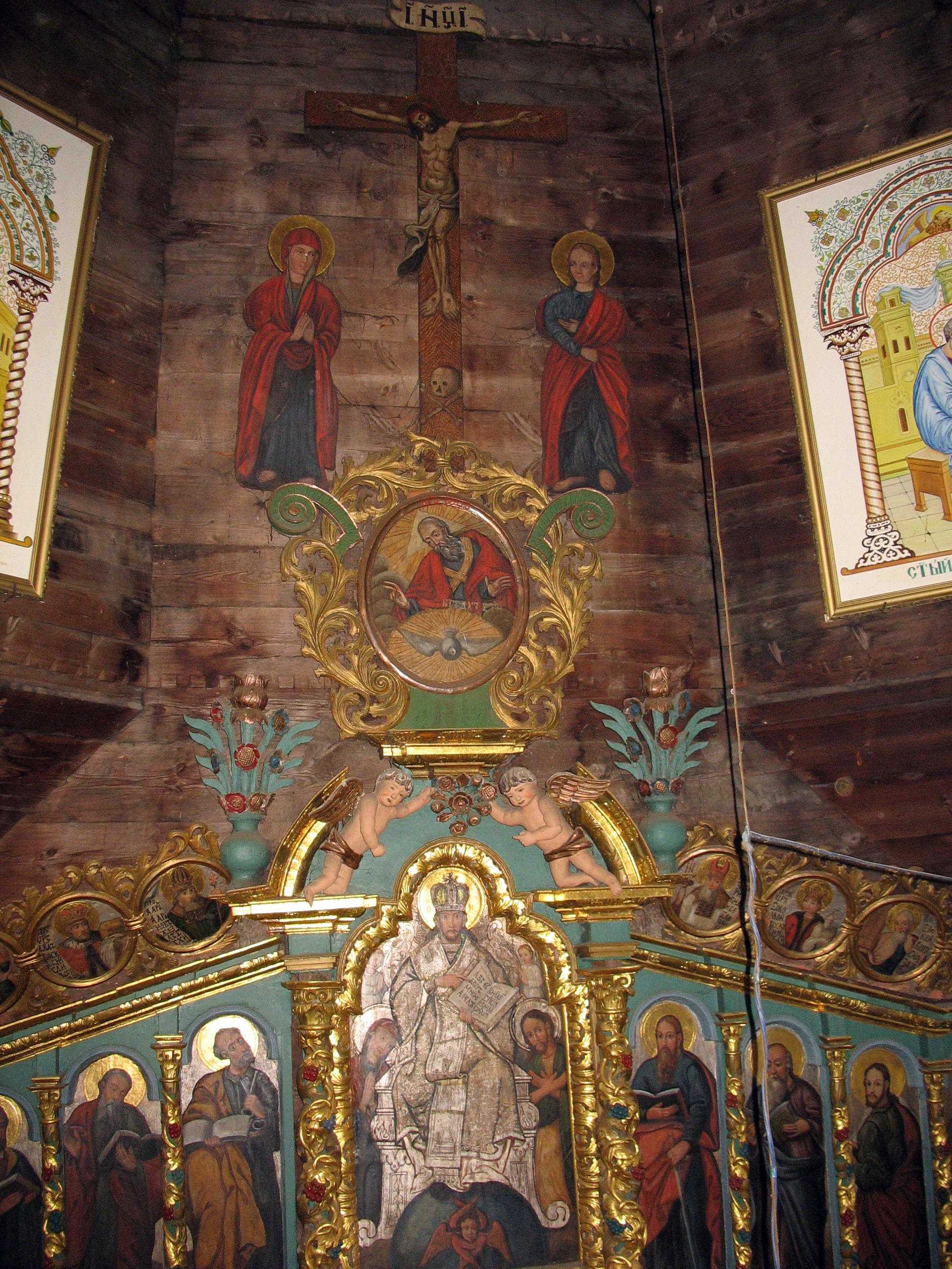 Центральна частина верхнього рядуРозмір зображення: 1944:2592 піксел Фото Зенона Боровця і Богдана Тхора, 5 вересня 2006 р. Вгорі – Розп’яття, під ним – бог-отець і св. дух, нижче – Моління. |