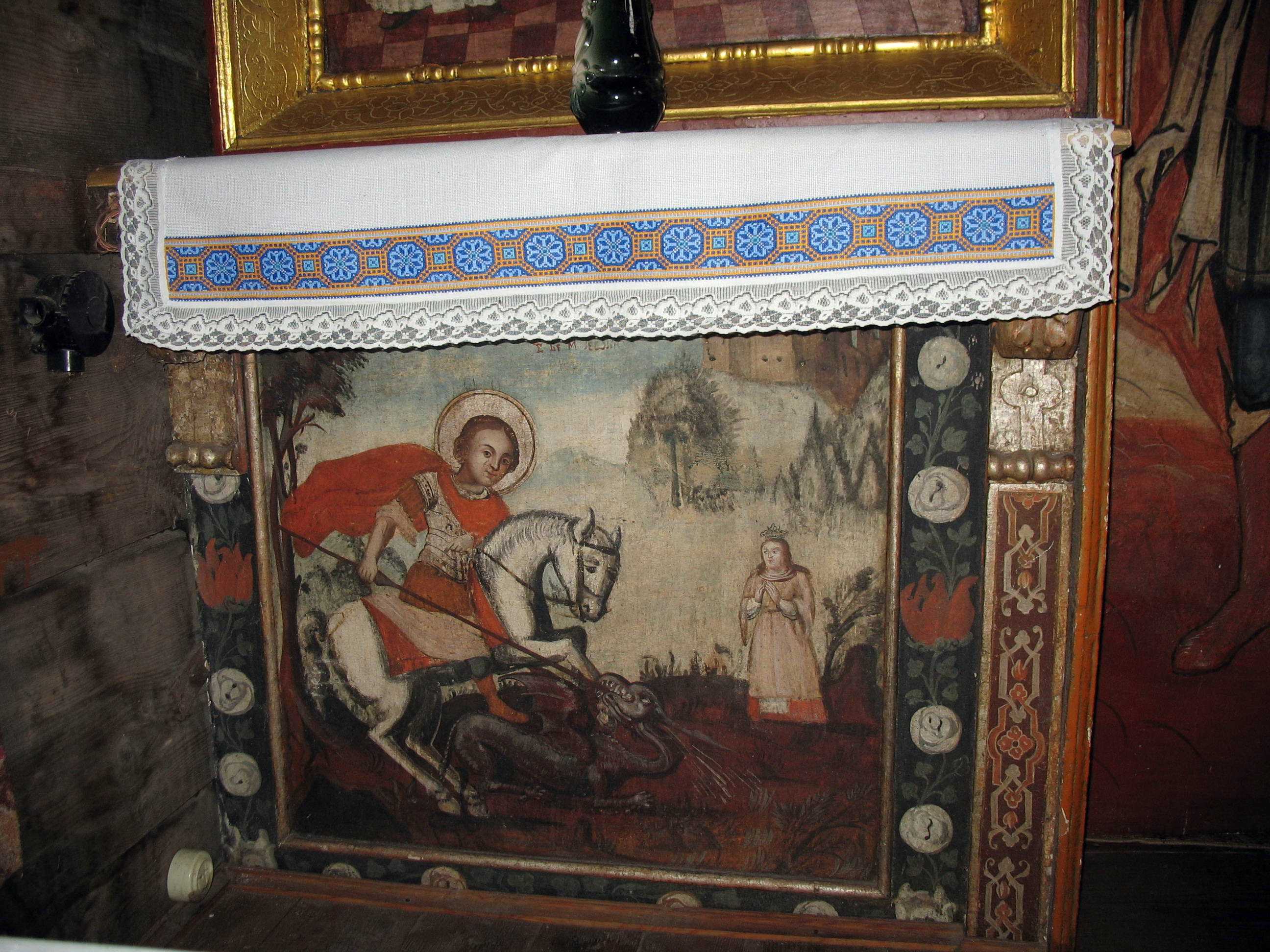Ікона «Чудо св. Георгія про змія»Розмір зображення: 2592:1944 піксел Фото Зенона Боровця і Богдана Тхора, 5 вересня 2006 р. В ряді пределл під іконою трьох святителів. |