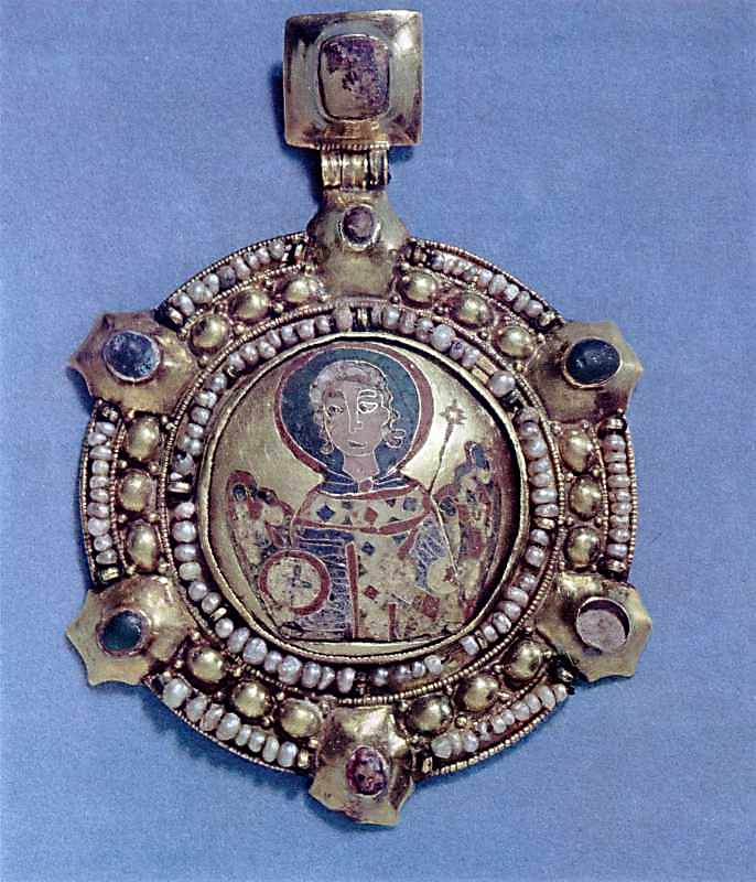 Медальон (с изображением архангела) от ожерелья из клада, найденного в 1900 году у села Сахновка, Каневского уезда. Киевской губернии (увеличен)