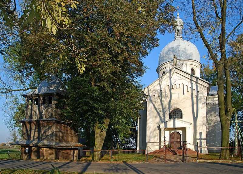 Obok kościoła drewniana dzwonnica z r. 1890, konstrukcji słupowo – ramowej, na drewnianych peckach, o uskokowo zwężających się trzech kondygnacjach; hełm kopulasty z balasem i cebulką zwieńczoną żelaznym krzyżem