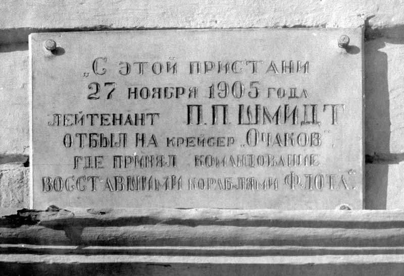 Меморіальна дошка на честь лейтенанта П.П. Шмідта. Фото 1974Розмір зображення: 800:547 піксел Із Графської пристанi П.П. Шмiдт вiдбув на повсталий крейсер. Тут встановлена меморiальна дошка (1950; мармур). |