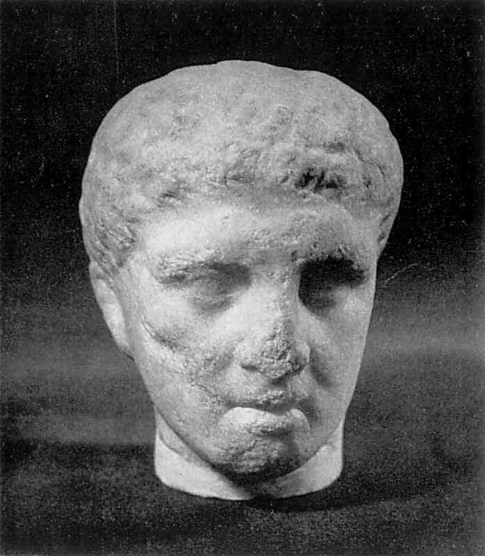 Голова статуї юнакаРозмір зображення: 698:800 піксел Голова статуї юнака (школа Скопаса) з Херсонеса. IV-III ст. до н.е. Мармур. Висота 13 см. Херсонеський історико-археолопчний музей. Джерело: Античне мистецтво. – К.: Мистецтво, 1977 р., № 35. |
