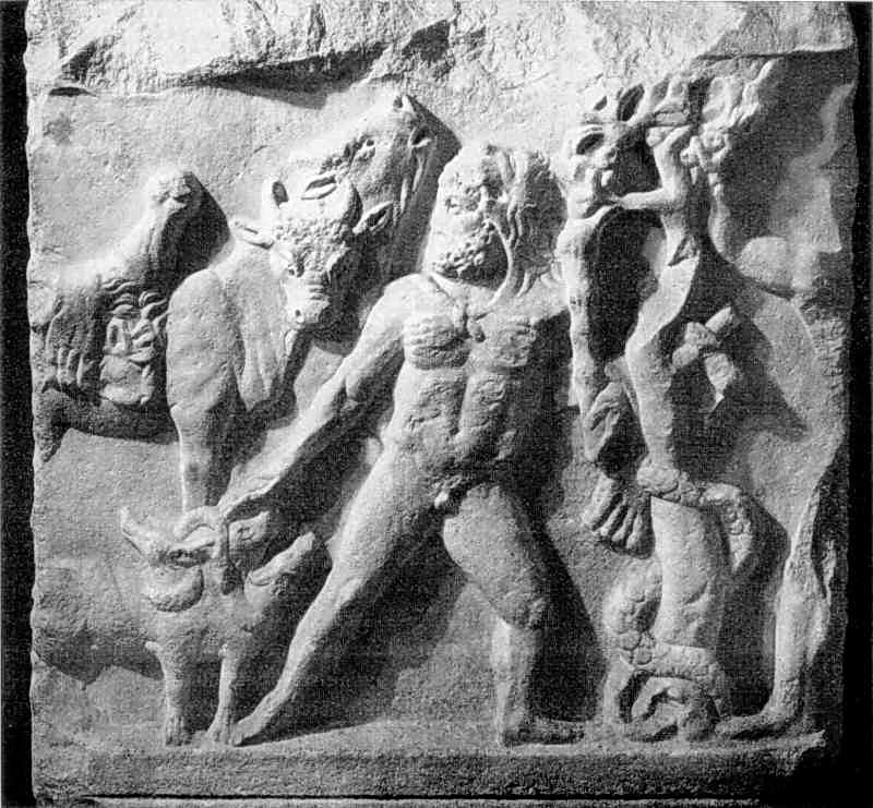 Серед рельєфів, знайдених у Херсонесі та на його околицях, привертають увагу рельєфи II століття н. е., що зображують Гераклові подвиги, – виведення Цербера з Аїда, приборкання крітського бика, викрадення яблук Гесперид тощо (іл. 41) [Г. Д. Белов. Херсонесские рельефы.- «Вестник древней истории», 1940, № 3-4, стор. 266-287].