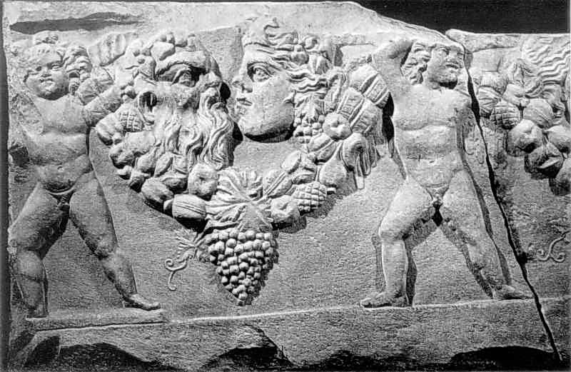 Мармуровий рельєф з зображенням Діоніса, Сілена, сатира та менади з Херсонеса. II ст. Херсонеський історико-археологічний музей.