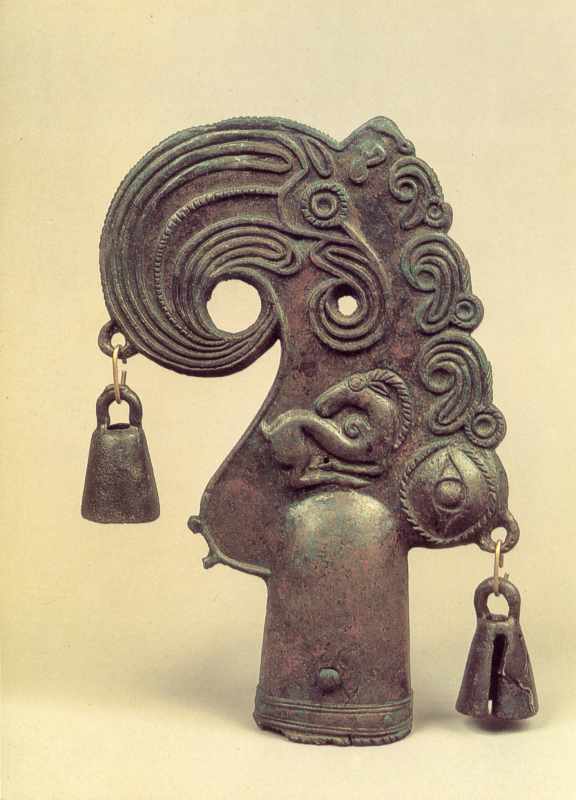 Навершя у вигляді голови птаха, на якій нанесено рельєфи голів птахів та лежачого козла, з підвішеними дзвіночками.