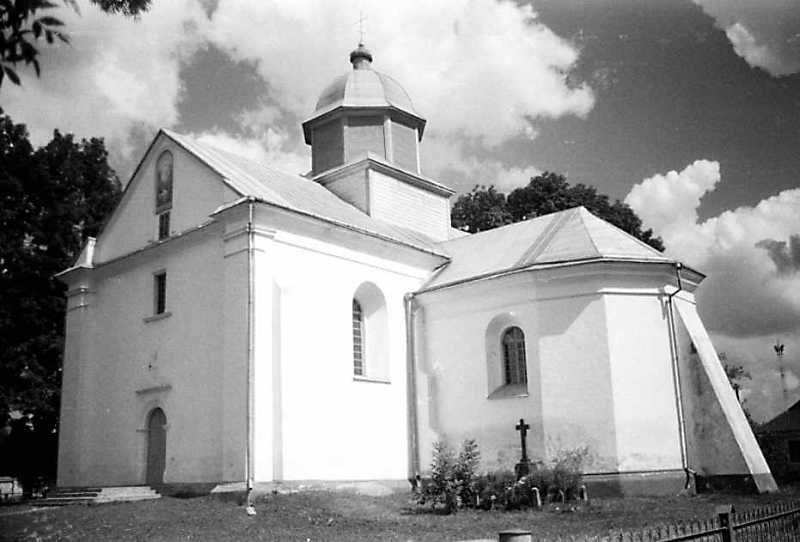 Церква Преображення 1637 р. орієнтація вівтаря 80° в центрі села, до головної вулиці С3, дзвіниця в позиції С3. Спостереження М.І.Жарких, 23 серпня 1991 р.
