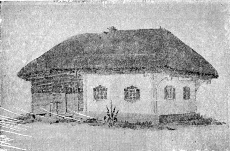 Хата в с. Шишаки, Полтавщина. Акварель П. ЮрченкаРозмір зображення: 800:526 піксел Джерело: Юрченко П.Г. Дерев’яне зодчество України. – К.: 1949 р., с. 75. |