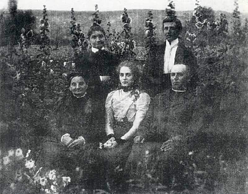 Сидять (зліва направо): Амброзина Левицька (сестра о. Олександра) – в заміжжі Лисинецька (народна вчителька в с. Підфилип ‘ї), Марія Балько – згодом дружина Модеста Левицького, о. Йосиф Балько – парох у с. Турильчу. Стоять: Йосифа (Зюня) Левицька (сестра о. Олександра), Володимир Балько (син о. Йосифа) – парох у с. Романівці.