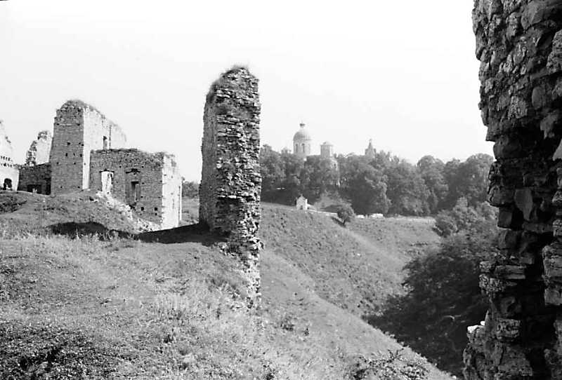 Фрагмент палацу, фрагмент муру 4, церква і башта костелуРозмір зображення: 800:542 піксел 1989 р. 17 серпня. Фото М.І.Жарких. Негатека, № 583-03. |