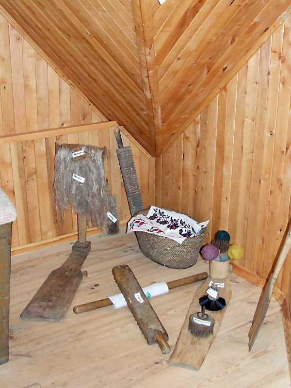 Предмети селянського побуту (2)Розмір зображення: 600:800 піксел 23 вересня 2011 р. Фото М.І.Жарких. Ліворуч – гребінка з мичкою, за нею до стіни притулений прач. В центрі – рубель і сувій полотна. Праворуч – деркачки. |