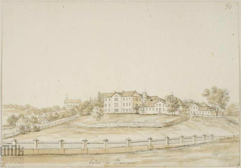 Widok elewacji bocznej pałacu Sanguszków i oficyn; z lewej strony w głębi kościół parafialny p.w. św. Doroty. 1874. Napis: Pałac w Sławucie; napis na podkładzie: Sławuta, – pałac. Wołyń. Rys. ołówkiem podmalowany sepią, 20,5x29,5. III-r.a. 4250 (Teka Wołyń). [Katalog rysunków architektonicznych ze zbiorów Muzeum narodowego w Krakowie. 1. Rysunki Napoleona Ordy / Opracowały Zofia Kucielska i Zofia Tobiaszowa. – Warszawa: Państwowe wydawnictwo naukowe, 1975, Nr. 653 (654?)]
