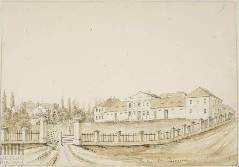 Stajnie pałacowe. Budynek parterowy z dwukondygnacjową częścią środkową zwieńczoną trójkątnym przyczółkiem oraz dwukondygnacjowymi skrzydłami. 1874. Napis: Stajnie w Sławucie; napis na podkładzie: Sławuta, – stajnie Wołyń. Rys. ołówkiem podmalowany sepią, 20,5x29,5. [H-r.a. 4251 (Teka Wołyń) [Katalog rysunków architektonicznych ze zbiorów Muzeum narodowego w Krakowie. 1. Rysunki Napoleona Ordy / Opracowały Zofia Kucielska i Zofia Tobiaszowa. – Warszawa: Państwowe wydawnictwo naukowe, 1975, Nr. 655]