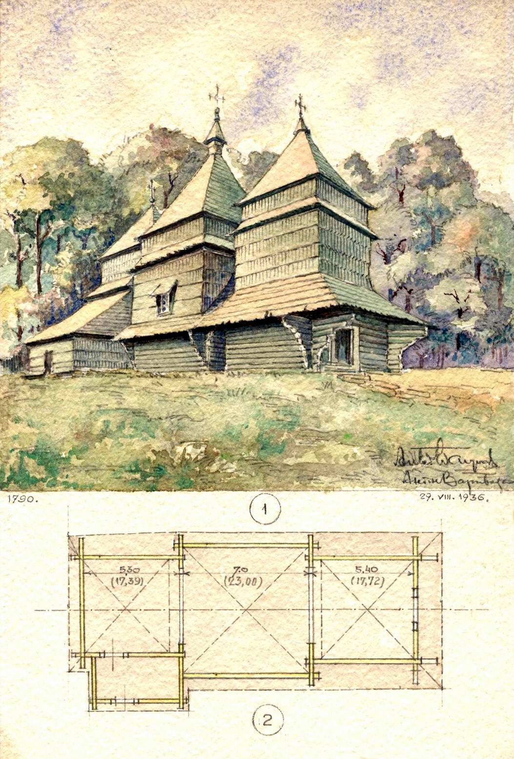 1936 р. Загальний вигляд з позиції А4; планРозмір зображення: 1053:1555 піксел Рисунок Антона Вариводи (Краків), 29.08.1936 р. 1790 Church, Smilnyk (Smolnik), Sanok, Poland. 1 – Northwestern view; 2 – Ground plan. |