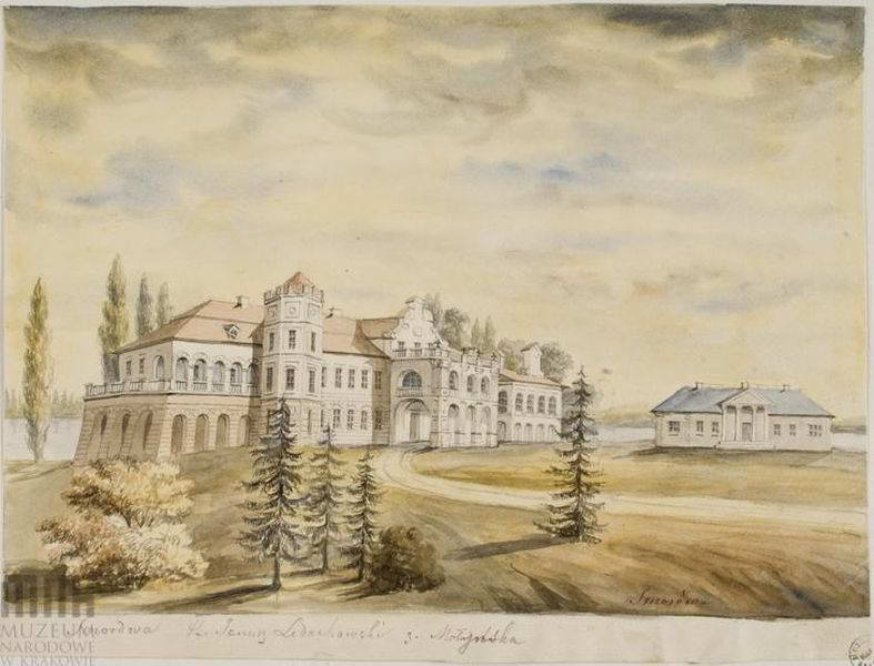 Pałac Ledóchowskich. Widok od strony podjazdu. Pałac dwukondygnacjowy z arkadowym podjazdem, nad którym loggie i taras, wieloboczną wieżą z krenelażem, tarasem wspartym na arkadowym murze oporowym i oranżerią; z prawej strony parterowa oficyna z portykiem kolumnowym. 1874. Napis: Smordwa. Smordwa H. Janusz Ledóchowski z. Mołyńska; napis na podkładzie: Wołyń. Smordwa, – pałac. Rys. ołówkiem podmalowany akwarelą. 21,3x28,4. III-r.a. 4260 (Teka Wołyń) [Katalog rysunków architektonicznych ze zbiorów Muzeum narodowego w Krakowie. 1. Rysunki Napoleona Ordy / Opracowały Zofia Kucielska i Zofia Tobiaszowa. – Warszawa: Państwowe wydawnictwo naukowe, 1975, Nr. 669]