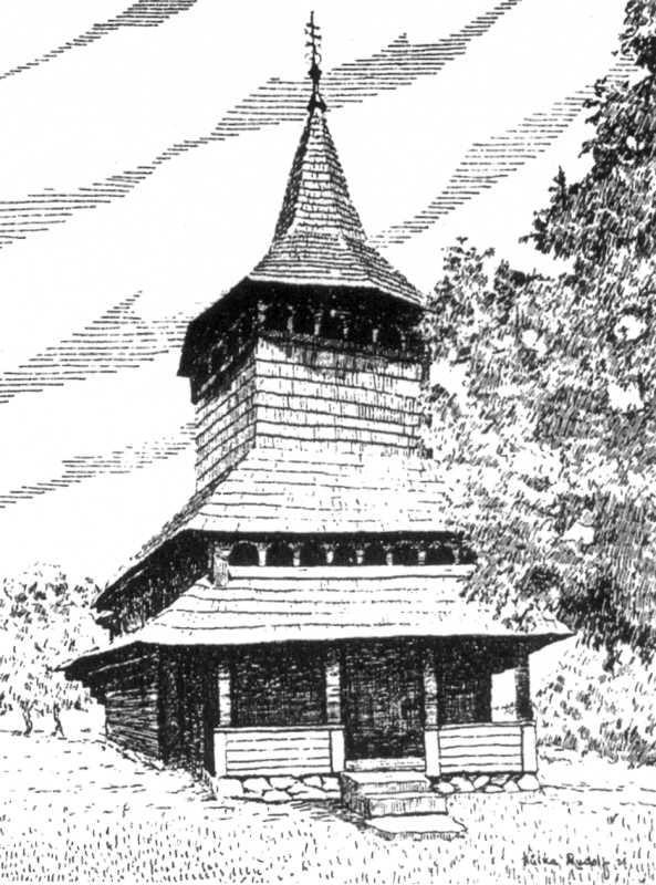 Сойми. Церква св. Василя Великого, 1898 р. Згоріла 1920 р. Малюнок Рудольфа Гульки для серії листівок. (R. Hulka. Podkarpatska Rus. Serie I. Praha. 1923.)