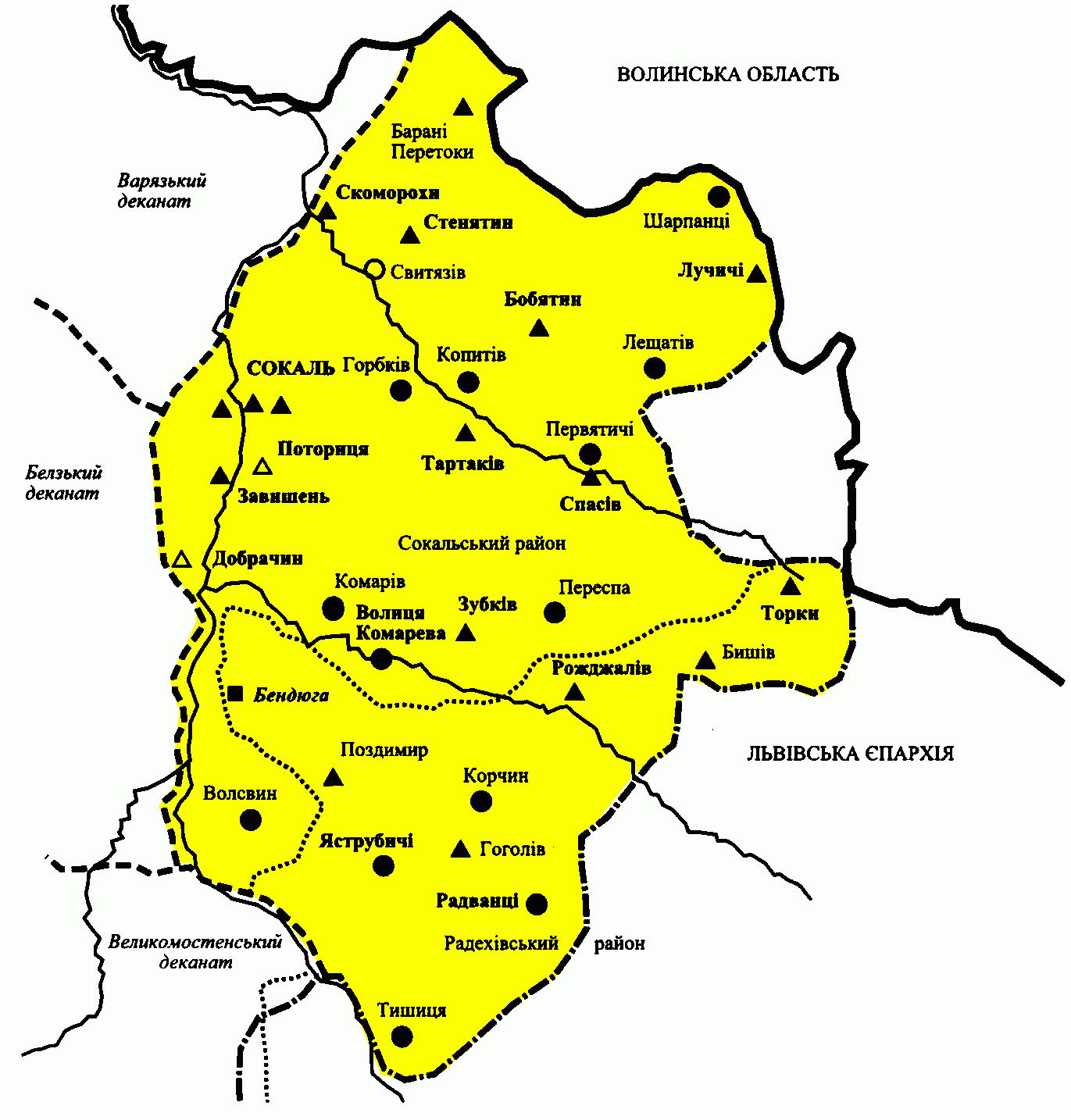 Картосхема деканату за В.СлободяномРозмір зображення: 1371:1434 піксел Джерело: Слободян В. Церкви України: Перемиська єпархія. – Льв.: 1998 р., с. 553. |