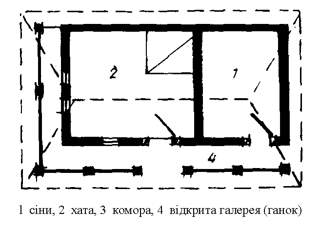 l – сіни, 2 – хата, 3 – комора, 4 – відкрита галерея (ганок), 5 – закрита галерея, 6 – піддашшя.