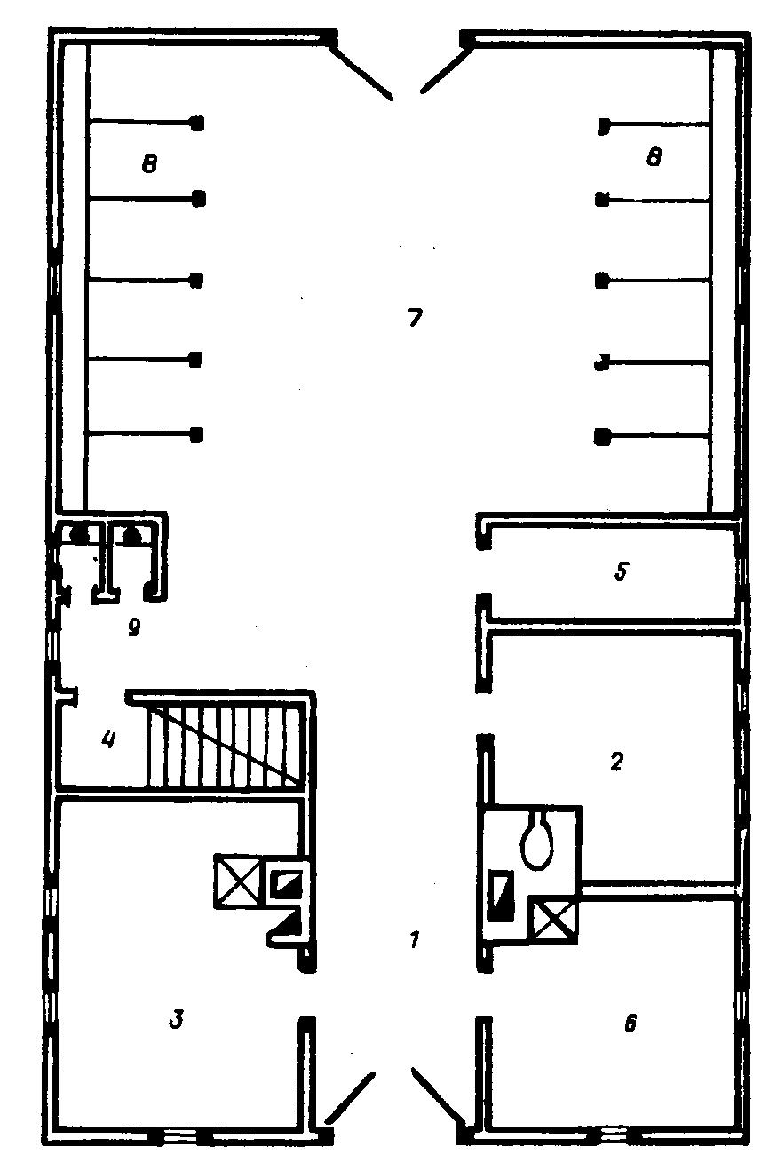 1 – сіни, 2 – житлова кімната, 3 – корчма, 4 – комори з винним льохом, 5 – ванькир, 6 – кімната для гостей, 7 – заїзд, 8 – стійла для коней з жолобами, 9 – туалет.