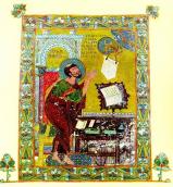Найцікавішими з художнього погляду є три мініатюри з зображеннями євангелістів Іоанна, Луки і Марка. На першій мініатюрі подано Іоанна з його учнем Прохором (іл. 273). Іоанн стоїть, молитовне простигши руки до орла (його символ), який тримає сувій, а Прохор на задньому плані сидить за низеньким столиком. Фігури передано суто живописною манерою. Деякі прийоми наближають мініатюру до творів монументального живопису. Всю композицію вписано у квадрифолій (чотирилисник), облямований золотою смугою, покритою рослинним орнаментом.