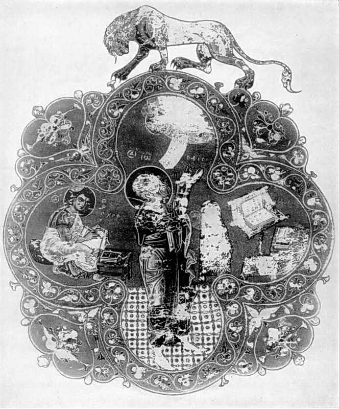 Євангеліст Іоанн. Мініатюра з Остромирова євангелія. 1056 – 1057 pp. Державна публічна бібліотека ім. М. Є. Салтикова-Щедріна (Ленінград).