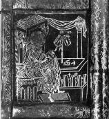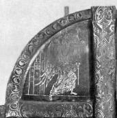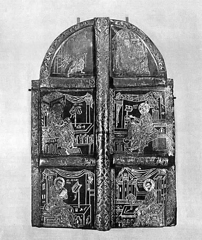 Подобная техника золотого письма применялась для украшения не только входных дверей порталов, но и внутренних, так называемых царских врат, отделявших алтарь от остальной церкви. Образцом могут служить небольшие врата из коллекции Н. П. Лихачева. Изображения сцены «благовещения» и четырех евангелистов на них близки к книжной миниатюре, а орнамент обрамления пластин с его растительным плетением и грифонами очень близок к орнаментике ювелирных изделий. По начертаниям букв в надписях лихачевские врата следует датировать серединой или второй половиной XII века. (с. 49)