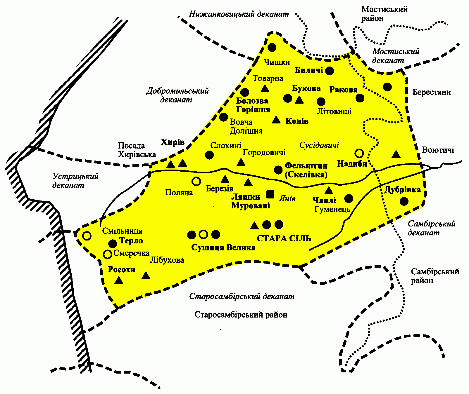 Картосхема деканату за В.СлободяномРозмір зображення: 1604:1350 піксел Джерело: Слободян В. Церкви України: Перемиська єпархія. – Льв.: 1998 р., с. 613. |
