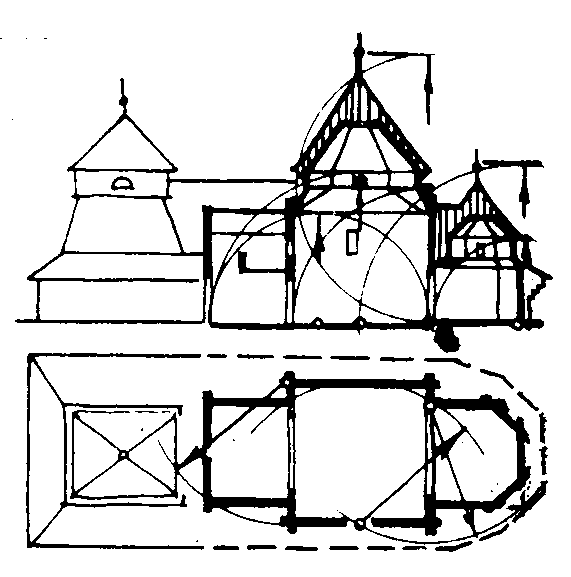 Воскресенська церква у смт Стара Сіль Старосамбірського р-ну Львівської обл. XV ст. Пізніша прибудова дзвіниці, план та розріз первісної частини.