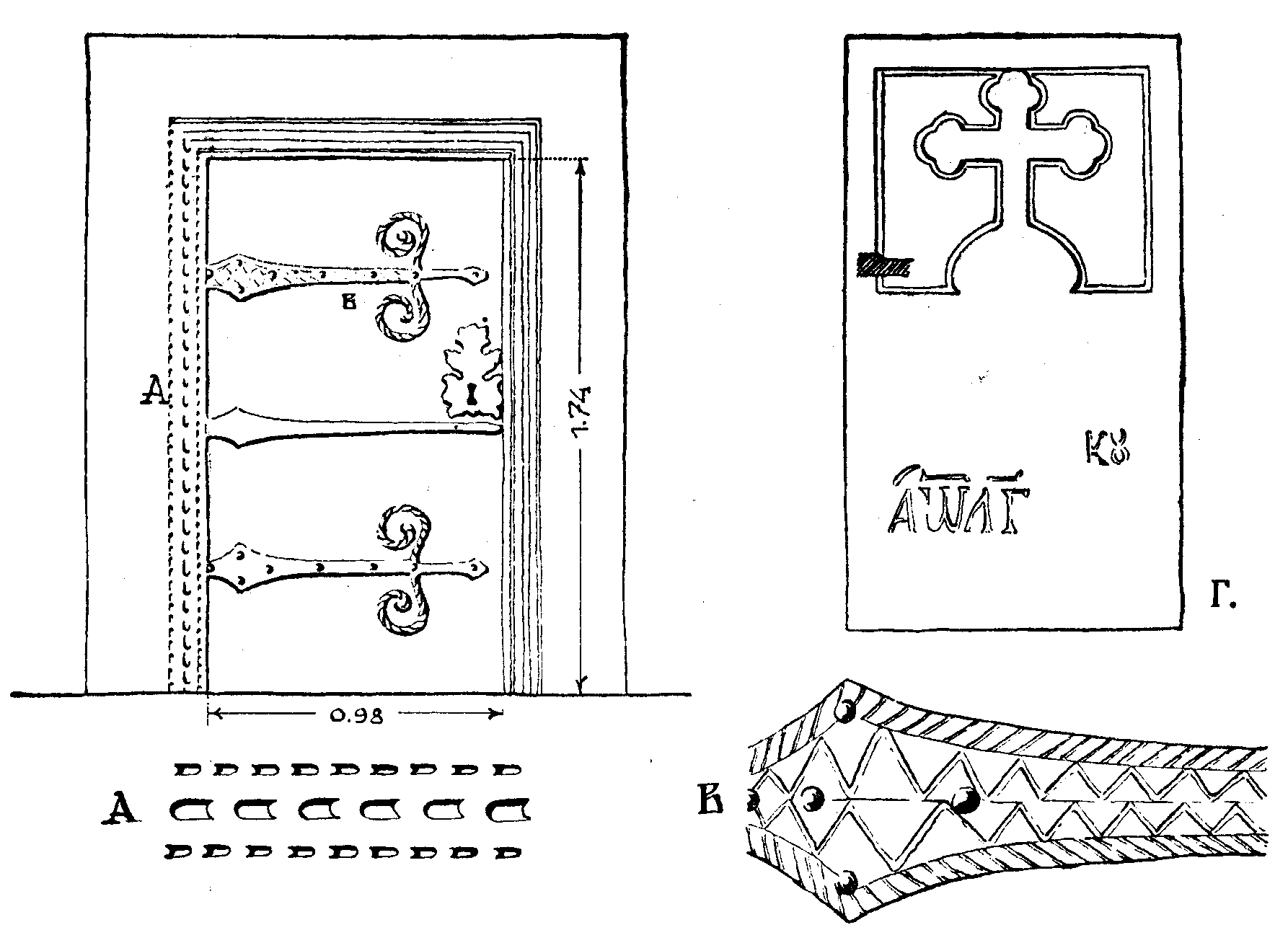 Головні двері церкви в Старому Селі. А – різьба одвірку; В – різьба желізних петлів. Г – Намогильний хрест перед церквою