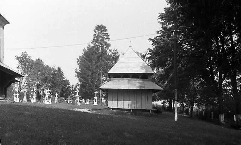 1989 р. Дзвіниця на тлі цвинтаря. Вигляд із заходуРозмір зображення: 800:481 піксел 1989 р. 11 липня. Фото М.І.Жарких. Негатека, № 539-14. |