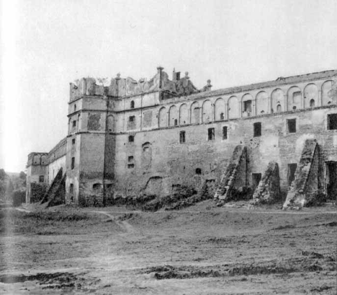 Замок (1584-1589, был реставрирован в 1654-1658). Его площадь в плане близка к треугольнику, короткая сторона которого 160 м, наиболее длинная (южная) 175 м. Длина стен по периметру около 500 м. В них устроены бойницы в три яруса – для нижнего, среднего и верхнего боя. Первоначально замок имел шесть башен, но сохранилось только три, а из многочисленных жилых сооружений -лишь два корпуса, южный и восточный. В завершении все они имеют глухую аркаду, а башни, кроме того, увенчаны еще белокаменными аттиками.Особенностью архитектуры замка является глухая аркада (высота 5,8 м), опоясывающая все его башни и стены со стороны фасадов.