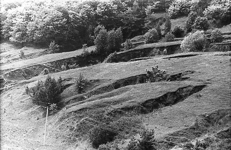 1984 р. Краєвид з ярами біля селаРозмір зображення: 800:519 піксел 1984 р. 30 травня. Фото М.І.Жарких. Негатека, № 271-24. |